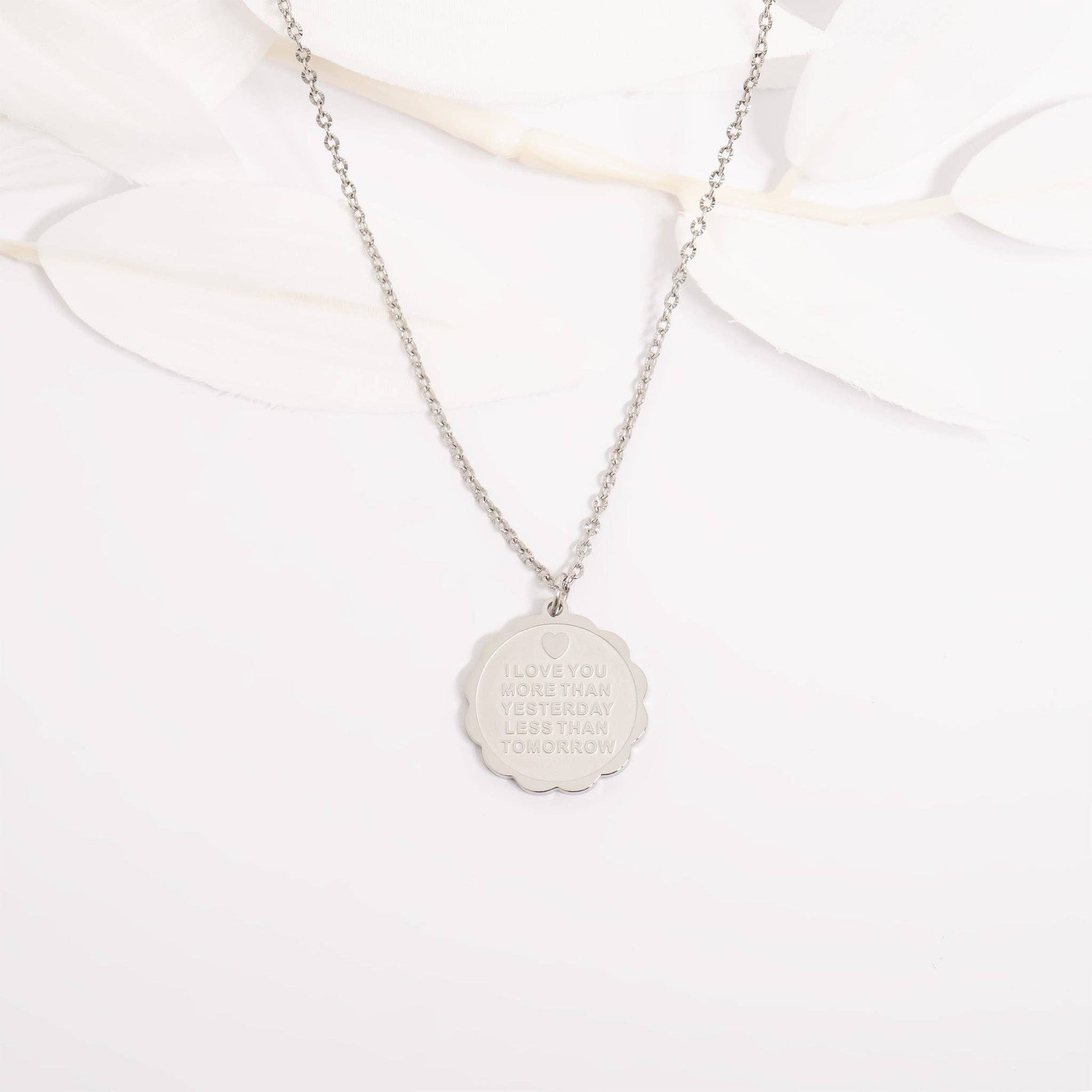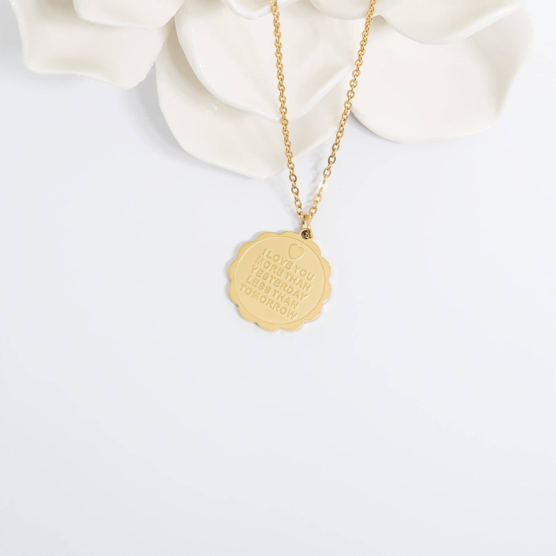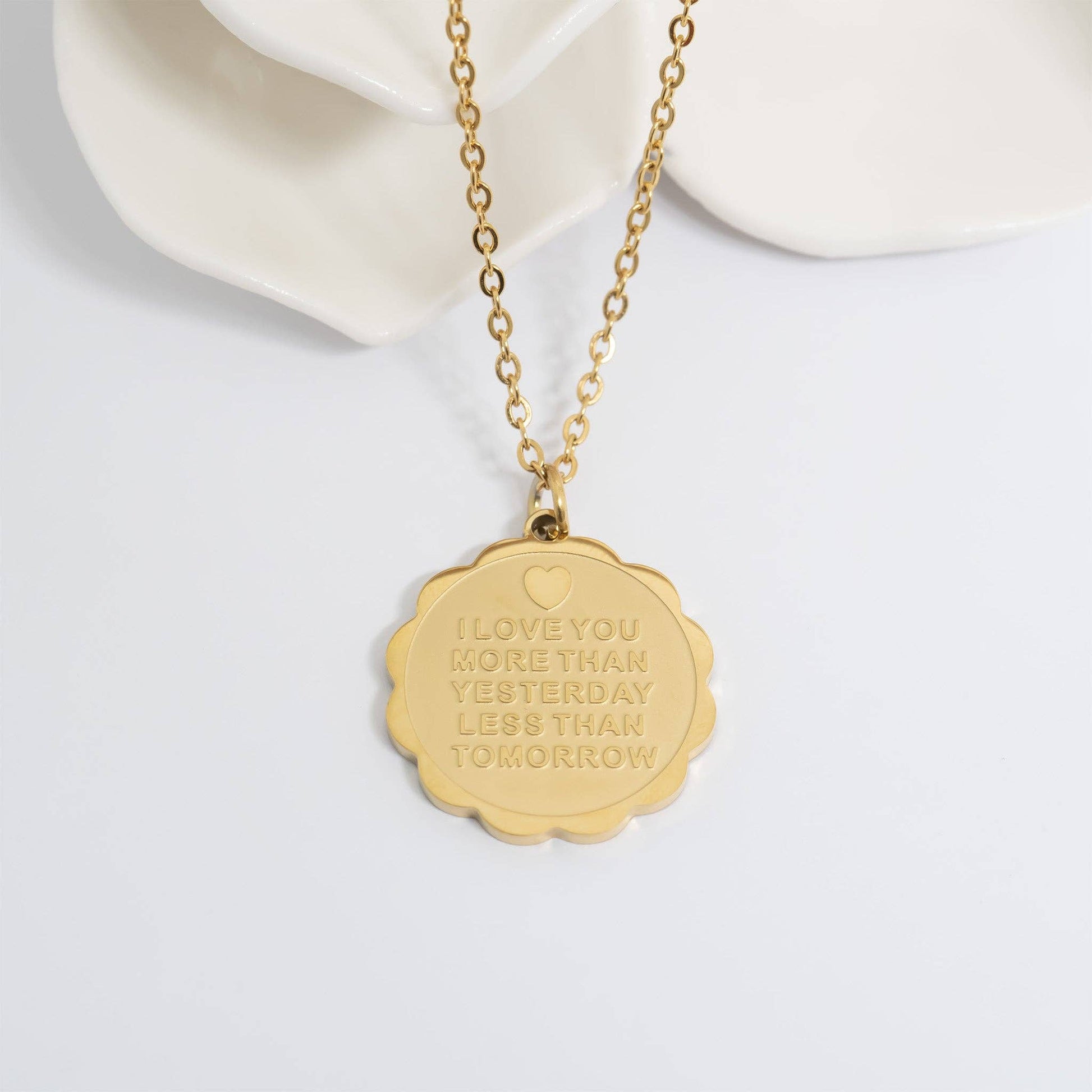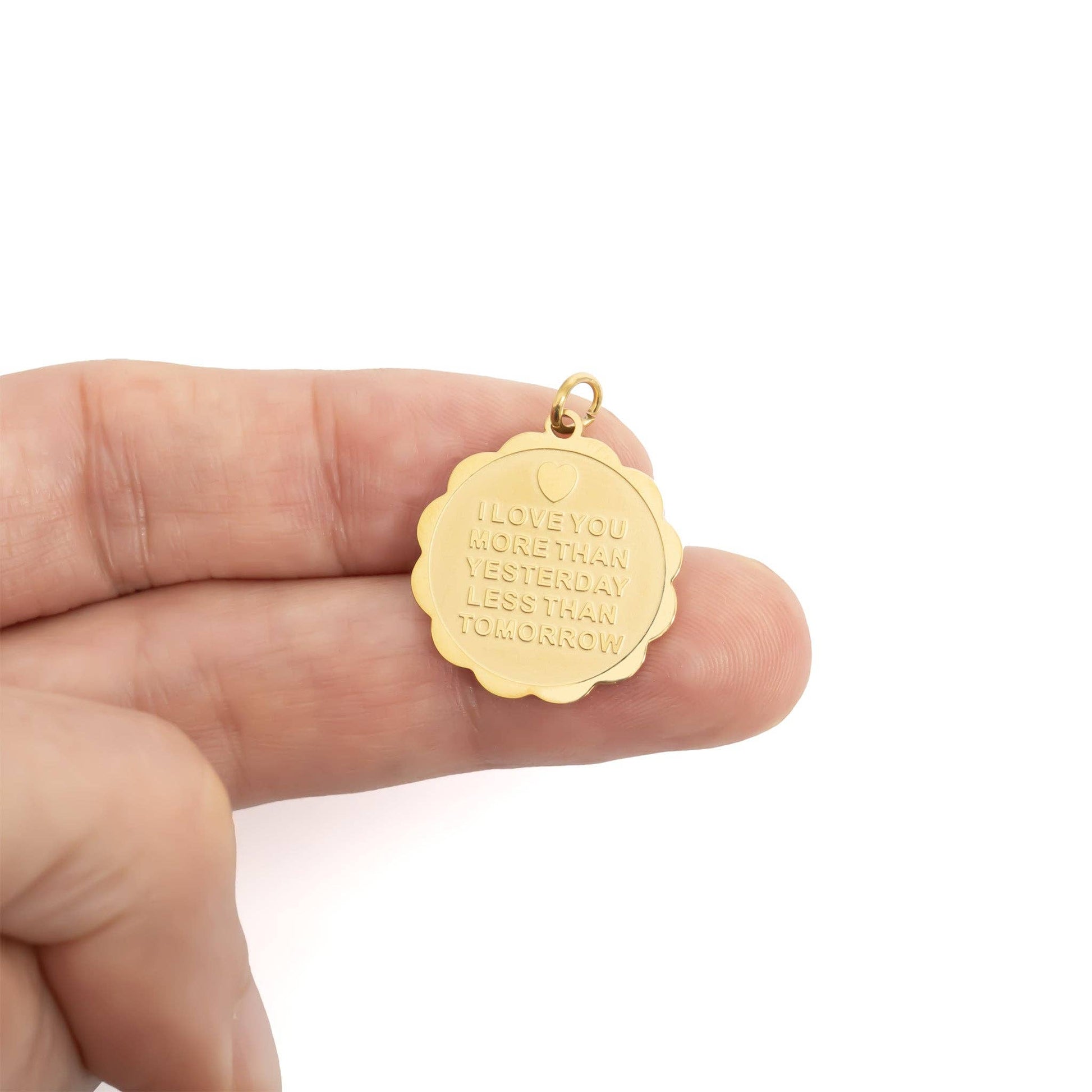 A waterproof gold charm with "I love you more than yesterday, less than tomorrow"